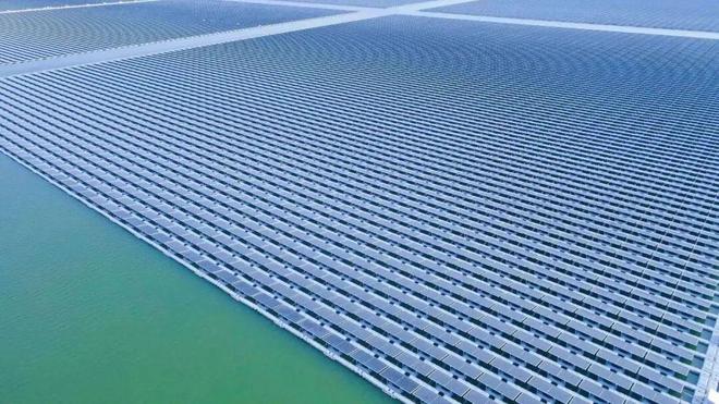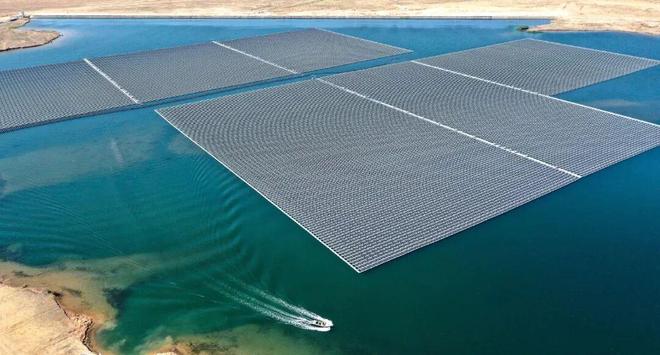 漂浮式光伏是将兆伏发电组件安装在水面漂浮体上,相对于陆地光伏成本更高。2023年11月9日,由中国企业承建的一带一路旗舰项目奇拉塔漂浮光伏项目实现并网发电,这是东南亚最大的漂浮光伏项目,对印尼乃至东南亚清洁能源发展起着重要的示范作用。下图为印尼奇拉塔漂浮光伏项目示意图。