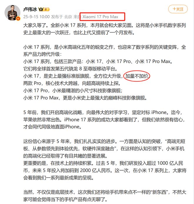 最关键的是,从卢伟冰官宣声明中的加量不加价可以得知。要是小米 17 系列标准版还是 4499 元起的话,那么苹果可就危险了。所以小雷觉得,选小米 17 还是选 iPhone 17,将会是九月手机圈谁也绕不开的热门话题。