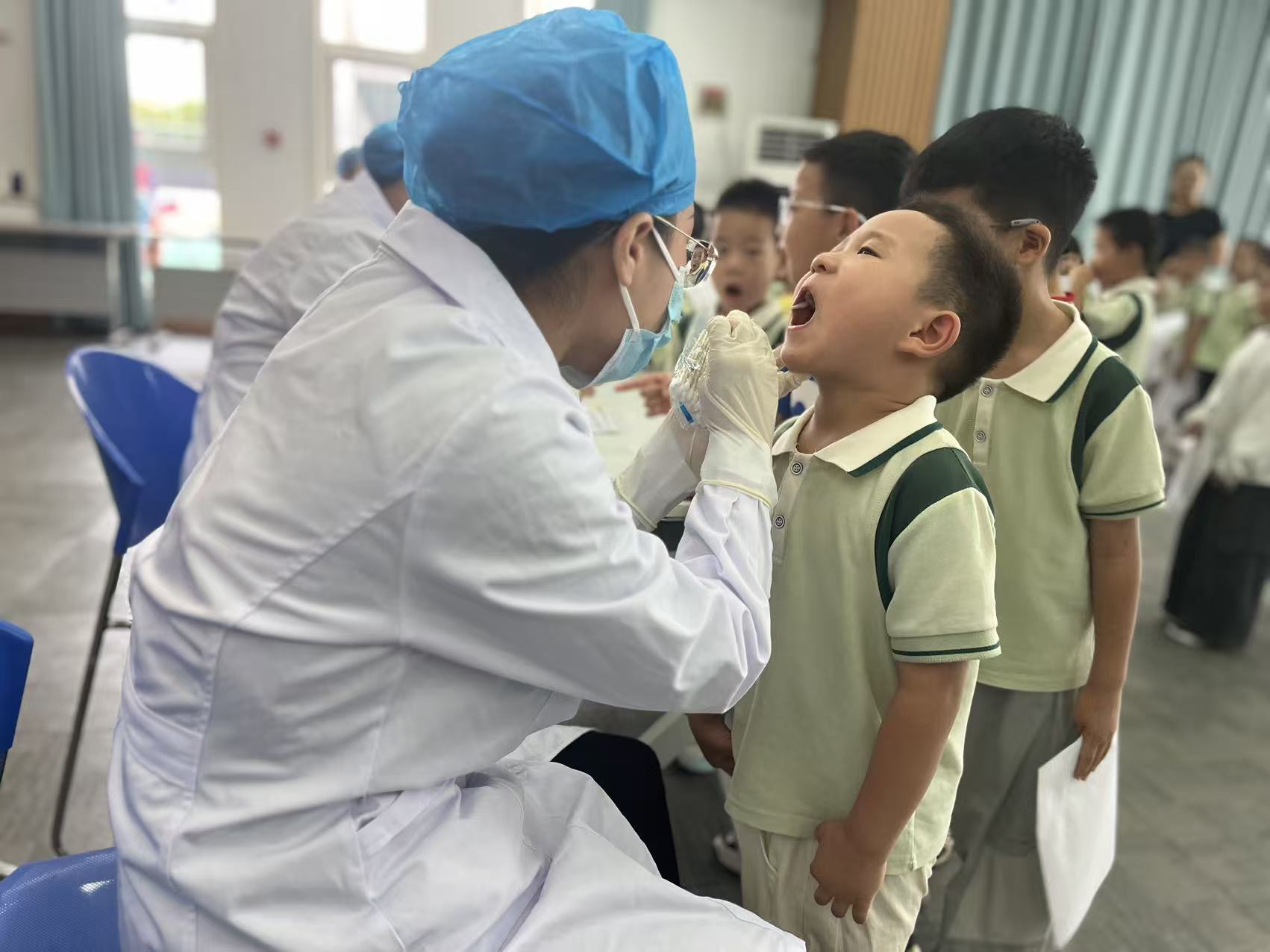 与此同时,胜利口腔的医护团队专程走进幼儿园,为中大班孩子带来免费口腔义诊服务。医护人员耐心细致地为每一位孩子检查牙齿健康状况,用浅显易懂的语言讲解龋齿预防知识,还现场示范标准刷牙姿势,手把手教孩子们掌握护牙技巧。