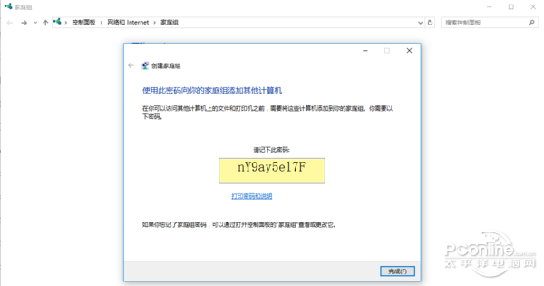 4、下一步,家庭组创建成功,创建的时候家庭组或随机生成一个共享密码,将密码记下来,因为以后的共享连接可能会用到。